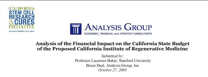 opening credits, title, and authorship, "Analysis of the Financial Impact on the California State Budget of the Proposed California Institute of Regenerative Medicine," by Laurence Baker, Stanford University, October 27, 2003